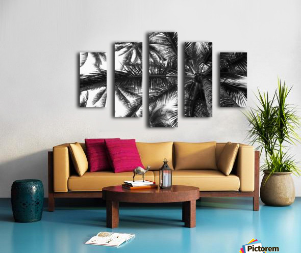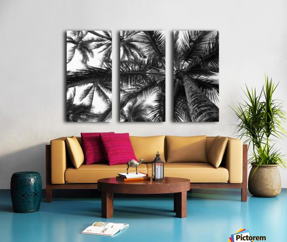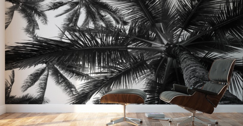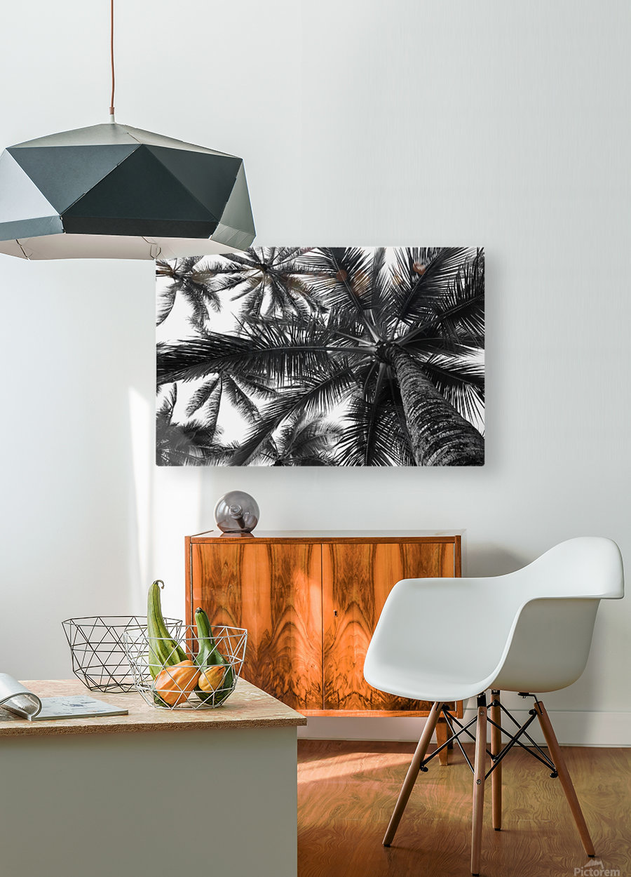 ABOUT THIS ARTWORK: LOW ANGLE VIEW OF COCONUT PALM TREES IN BLACK AND WHITE; HONOLULU, OAHU, HAWAII, UNITED STATES OF AMERICA