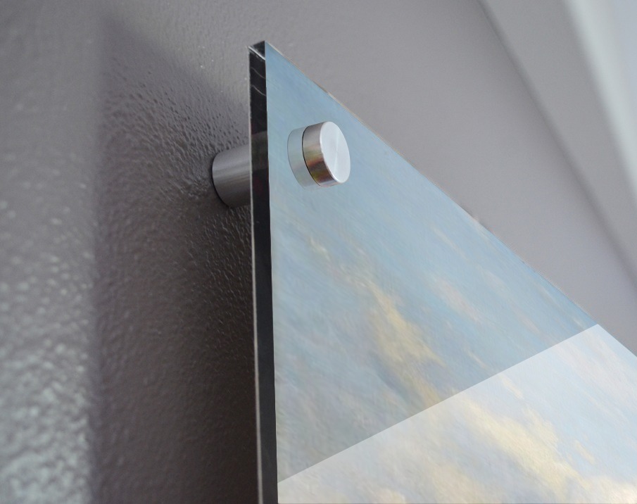 Printed to the edge - Ready to hang - provided with 4 premium polished aluminum stand off ( wall screws and mounting hardware provided )