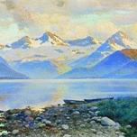ABOUT THIS ARTWORK: LARGE RUSIAN LAKE WITH MOUNTAINS IN THE BACK