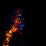 UV makeup barely tracing the profile of a model, recalling the fire and ice theme, the profile of the face is given by the eye filling the negative spaces