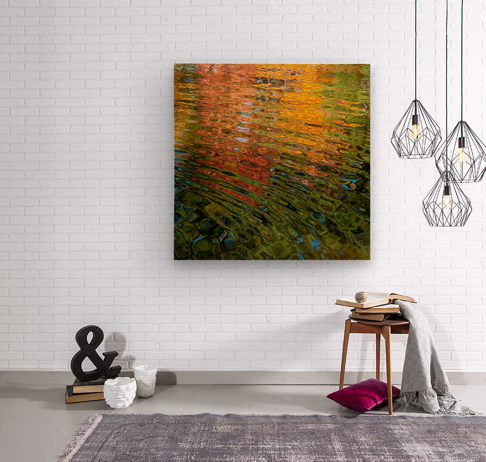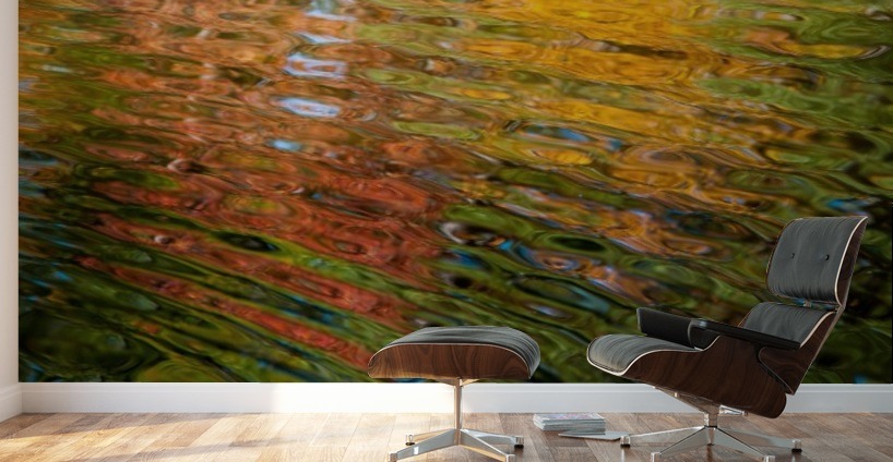 Beautiful autumn colors reflecting in water with ripples caused by a mild breeze. The colors come from different varieties of trees surrounding the water as well as the bark of the trees.