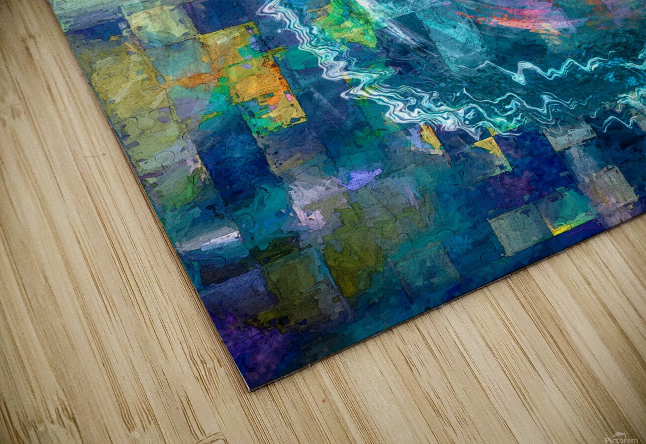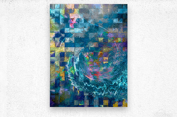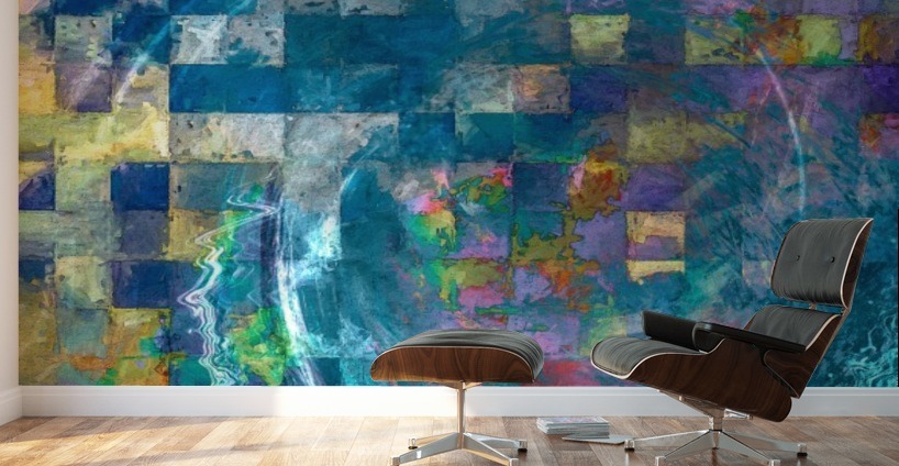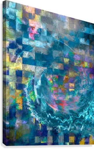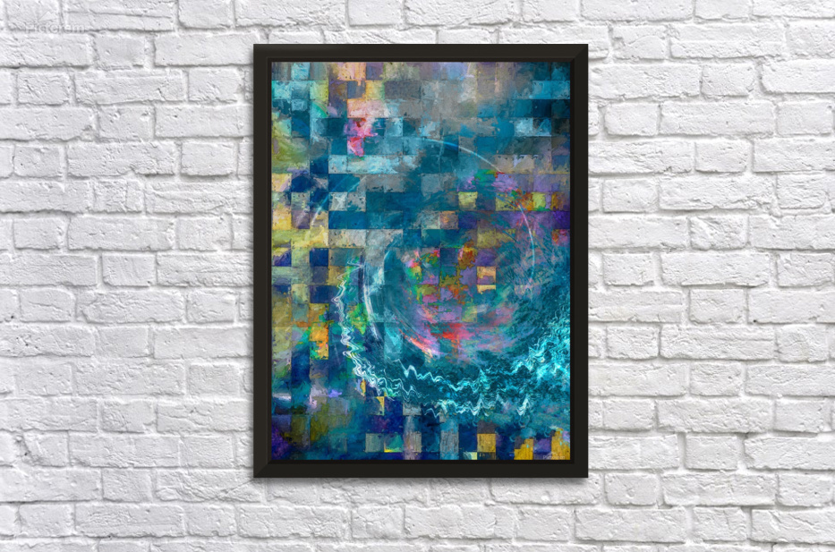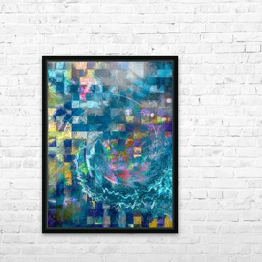 A current of blue-white waves encircle and entwine over rough squares of color in this abstract digital art by Jon Woodhams.