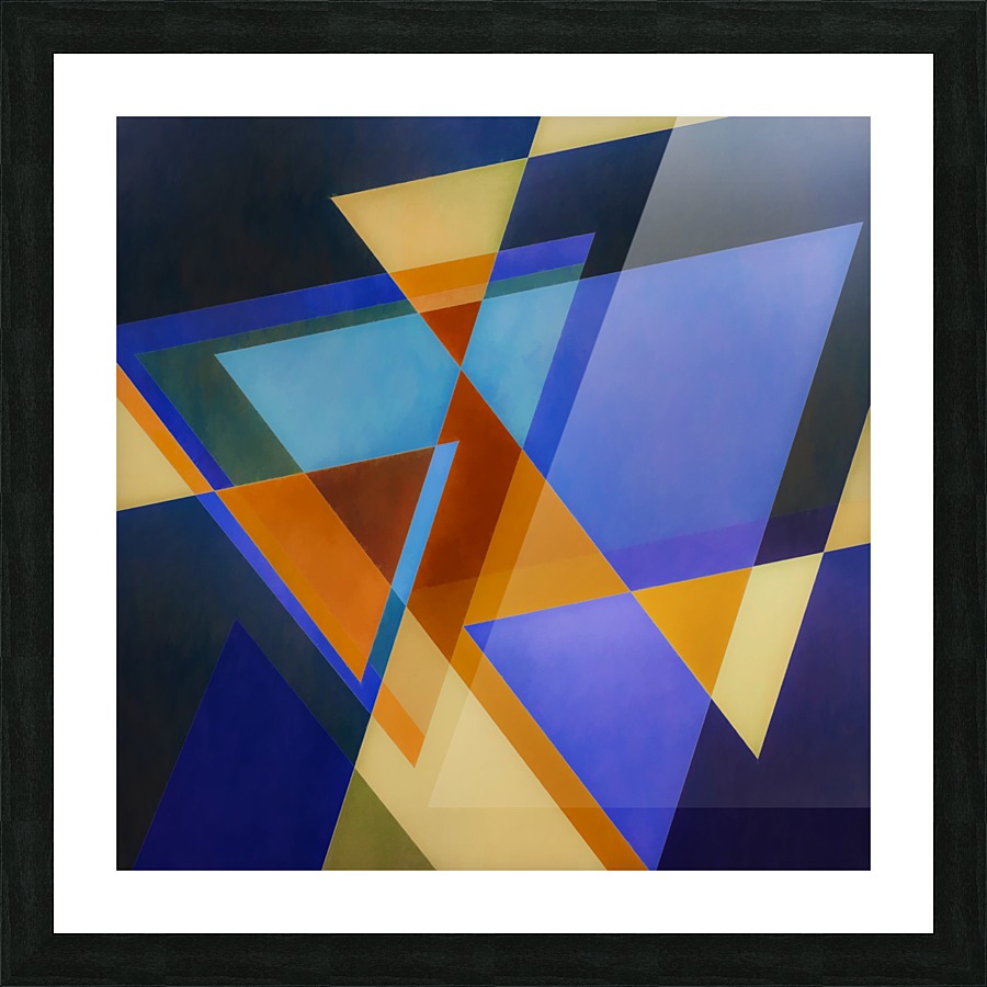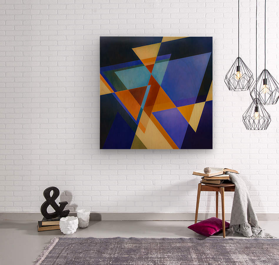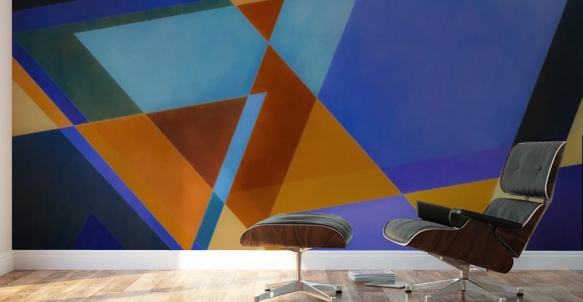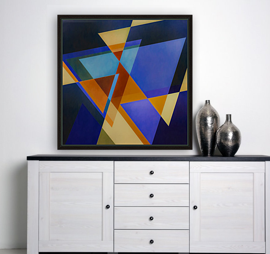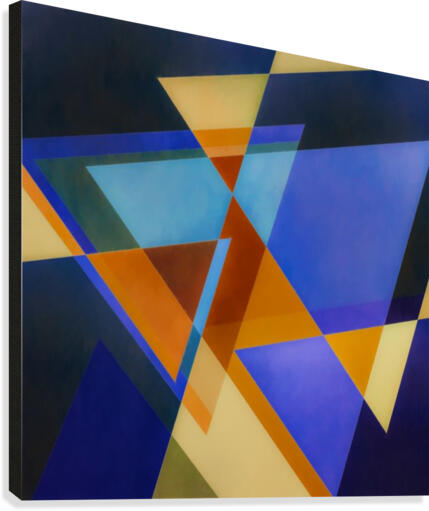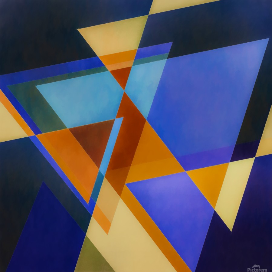 Triangular forms point upward like a flight of multi-hued arrows in this striking geometric work from Jon Woodhams.