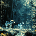 Track Of The Wolf -Two Gray Wolves. Two wolves stand at the edge of a forest clearing, bathed in a mysterious blue light that filters through the tree...[+]