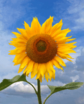 A close up photograph of a vibrant sunflower standing tall against a blue sky dotted with white clouds. The bright yellow petals make a great contrast...[+]