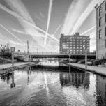 A black and white photo of a quiet morning with clouds from jet plane streams streak over the Gene Leahy Mall park area in downtown, Omaha, Nebraska, United States. I'm standing at the center of the little lake looking towards the 10th Street bridge. The jet streams are reflecting on the pond with rippling water. I took this during the fall season. This photo was taken by Jennifer White with Timeless Moments Photography. All images are copyrighted © Timeless Moments Photography/Jennifer White. All rights reserved. Please note the watermark does not print on ordered products.
