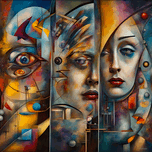 AI FUTURISTIC TRIPTYCH OF A WOMAN EVOLVING FROM COMPUTER BLUEPRINTS CREATED BY DALI AND KANDINSKY INFLUENCE. LOOKS KILLER ON CANVAS.