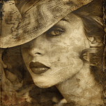 Artwork Title: "Vintage Allure" Medium: Digital Mixed Media (Sepia-Toned Portraiture) Technical Elements: Texture and Aging Effects: The image incorporates a distressed, aged paper texture with visible cracks, scratches, and faded edges, creating an authentic vintage appearance. Lighting and Depth: Subtle lighting enhances the contours of the subject's face, highlighting key features such as the lips and eye beneath the shadowed hat brim. Composition: The close-up framing with an off-center gaze draws immediate attention to the subject's intense expression and adds an air of mystery. Monochromatic Palette: The sepia tones combined with high contrast between light and shadow emphasize the timeless, nostalgic quality of the piece. Artistic Influences: Hollywood Glamour Photography: Echoes the elegance and sophistication of classic 1940s and 1950s Hollywood portraiture. Pictorialism: The soft-focus aesthetic combined with rich texture recalls early photographic movements emphasizing beauty and emotion over realism. Fine Art Collage Techniques: The layered textures suggest influences from collage art, blending digital and analog aesthetics seamlessly. Symbolism & Themes: Mystery and Intrigue: The partially obscured face and direct eye contact suggest an enigmatic narrative, inviting viewers to interpret the subject's story. Timeless Beauty: The classic styling and nostalgic tone celebrate enduring elegance and femininity. Memory and Nostalgia: The aged aesthetic evokes a sense of lost time, appealing to emotions related to memory and longing. Market Appeal: Interior Decor: Perfect for vintage-inspired spaces, luxury boutique hotels, and stylish home interiors seeking a touch of old-world charm. Fashion and Editorial Use: Ideal for publications, advertising campaigns, or branding projects that embrace a retro or timeless aesthetic. Fine Art Collectors: Appeals to collectors with an appreciation for vintage photography, mixed media art, and classic portraiture. "Vintage Allure" captures the essence of a bygone era while offering a fresh take on timeless elegance through digital artistry.
