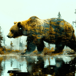 Bear River - Grizzly Animal. A large bear is depicted walking through a misty, wooded landscape, with its reflection clearly visible in the still water below. The bear's fur seems to be composed of forest scenery, merging animal and environment in the image. Vibrant digital art, contemporary art online, bold and colorful artwork, home decor ideas, belief-based, positivity-inspired art that evokes emotions. We aspire for precise creation, intricate vetting and high level post production techniques. #artforchange #artforyourhome #artforsalebyartist #buyartonline #newbeginnings #decorateyourhome #homedecor #wallart #walldecor #pictureoftheday #artoftheday #uniquegifts #giftideas #birthdaygift #giftsforher #wallartdecor #stagingtips #vibrantcolors #smartbuying #thebestofthebest