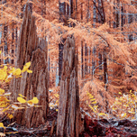 A vibrant autumn forest scene showcases trees with orange and yellow foliage. Broken tree stumps in the foreground contrast with the intact trees in t...[+]