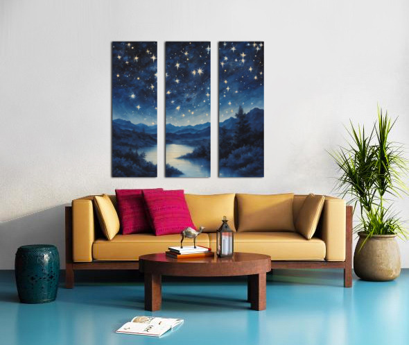 Gaze upon the heavens with this celestial masterpiece. Stars twinkle against a backdrop of deep indigo, inviting viewers to lose themselves in the vastness of space and time.