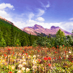 Looking over a Paintbrush Flower field, the Canadian Rocky Mountains near Jasper National Park stand at attention to beautifully frame the flowers and...[+]