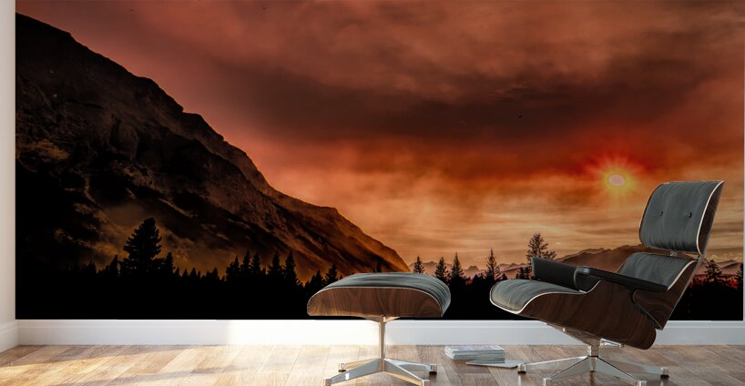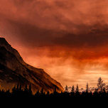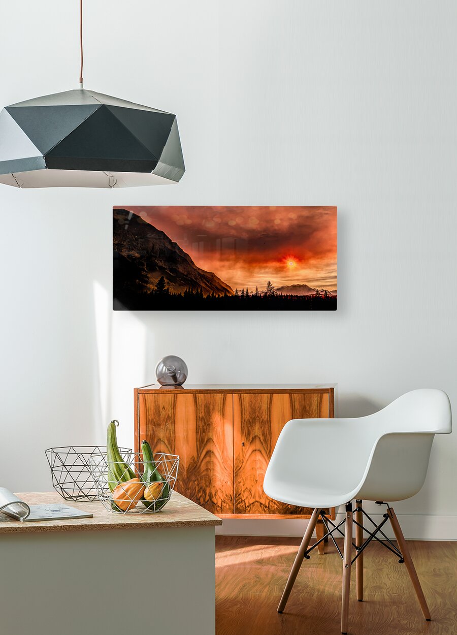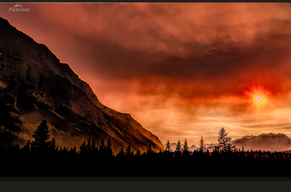 It was the year of the fire in the Canadian Rockies. We had a trip planned to go Banff, Canada and the surrounding areas, but massive fires south and west of us almost stopped our trip. We decided to chance the trip and one of the days passing on the Trans-Canada Highway, near Canmore and Banff, almost stopped me cold as we attempted to travel north to get away from the smoke. The sunrise was unsettling to say the least as the colors changed into unusual shades of orange almost blocking out the sun. I quickly grabbed by camera and validated the colors I was seeing framed by the adjoining the nearby mountain silhouetted against the unique almost night time appearing sky.