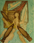 Space-time 4 dimensions plus. We think of life and time from birth to death as linear. Plotted on a graph from 1 day to 99. Yet, if you graph in a cube within a cube each year depending on point of view and perspective is not linear. Past,present, and future all exist as particles and waves in space from different angles and perspectives. This painting represents cubes within cubes the 4 dimensions and possibly more with the flying or swimming woman each between dimensions. The 2 mirrors represent man seeing self at different ages as he looks at the mirrors in the present to see self in the the future and looking back in the past from the other side of the mirror to see younger self. Elder to middle age, adult to 2 year old, and 3rd mirror, teen to future without looking back. The mirrors are like telescopes depending on the origin point/waves where the light reflects. In the center is a mother to be, pregnant ready to give birth. She sees in the mirror her 2 year old son sucking his thumb.