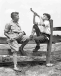 Get this artwork "1930s 2 BOYS SIT ON SPLIT FENCE PRACT. BUGLE HORNS 232613" in a framed print.