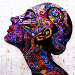 Lunar Isle - Eclipse Psychology. A vibrant profile of a woman's face is depicted, featuring an intricate mosaic of colors and psychedelic patterns...[+]