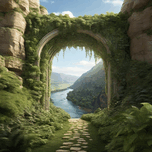 An archway of lush vegetation frames the entrance to a secluded valley, where a river meanders gently between verdant cliffs, creating a tableau of ti...[+]