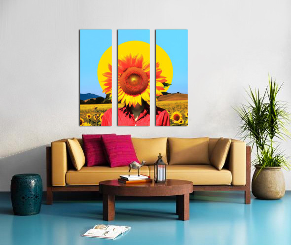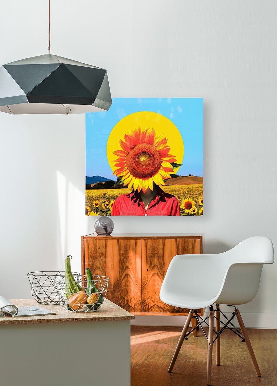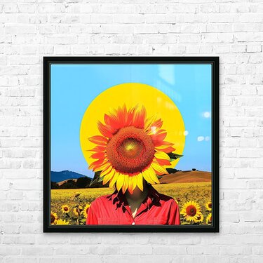 Sun Flower - Sun Worshiper. A person's head is replaced by an oversized sunflower against a bright circular backdrop, creating a surreal portrait. They stand in a field full of sunflowers under a clear blue sky, wearing a red shirt that contrasts with the yellow and green around them. Vibrant digital art, contemporary art online, bold and colorful artwork, home decor ideas, belief-based, positivity-inspired art that evokes emotions. We aspire for precise creation, intricate vetting and high level post production techniques. #artforchange #artforyourhome #artforsalebyartist #buyartonline #newbeginnings #decorateyourhome #homedecor #wallart #walldecor #pictureoftheday #artoftheday #uniquegifts #giftideas #birthdaygift #giftsforher #wallartdecor #stagingtips #vibrantcolors #smartbuying #thebestofthebest