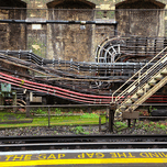 Exposed electrical elements and stairs on the side wall of this London Tube subway station make a colorful scene. The historic project was finished i...[+]