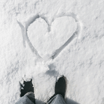 Horizontal scene in first person perspective of a heart shape written in the soft ice under the feet of a person having a romantic snow vacation. Falling for you