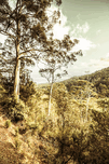 Gorgeous Australian landscape view of gumtree bushland facing off a hilly cliff. Huon Valley Tasmania Australia