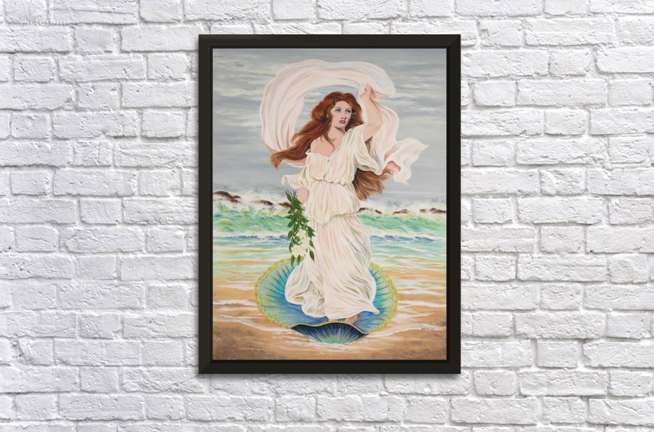 Aphrodite Goddess of Love was painted by Dale Morrish in 2023 with acrylic paint. Dale was inspired by the beauty and grace of Aphrodite. She depicted her late mother's beauty within her face. This piece is unique and very special to the artist.