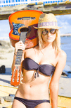 Young Sassy Female Performing Artist In Bathing Costume Dark Glasses And Summer Fashion Hat Holding Acoustic Guitar At An Oceanic Port