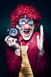 Excited Young Male Photographer Clown Holding Camera While Shouting Out Cheese At A Kids Birthday Party Celebration On Dark Studio Background