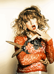 Vintage portrait of a pretty brunette beauty with curly hair holding garden secateurs with a surprised expression in a to cut or not to cut hair style...[+]