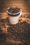 Old style fine art photo of a cafeteria cup holding brown coffee beans on old wooden advertising. Retro snack bar