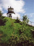 This photograph captures a lighthouse perched atop a hill, reached by a flight of stairs. Small shrubs grow around the base, and the beacon chamber at the top is encased in glass with a railing circling the exterior. Owls Head Lighthouse sits on an 80 foot bluff overlooking Penobscot Bay, near the entrance to Rockland Harbor in Maine. The lighthouse was built in 1825 and rebuild in 1852 and the Fresnel Lens dates back to 1856. This image was taken on a lighthouse road trip to visit several of the lighthouses along the coast of Maine. ©Copyright 2003 Lorraine Palumbo. All Rights Reserved.