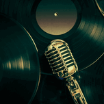 Classic green still life photo with a vintage mic on blank Long Play Records. Recording studio art