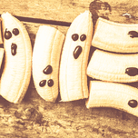 Scary halloween still life on a stack of fruity ghosts on rustic country kitchen bench. Healthy halloween dessert