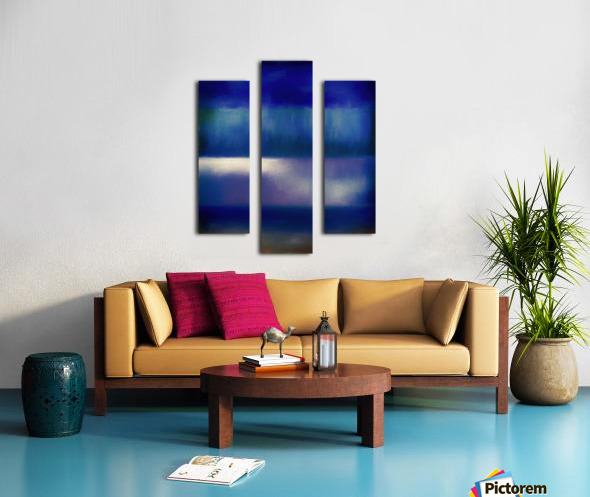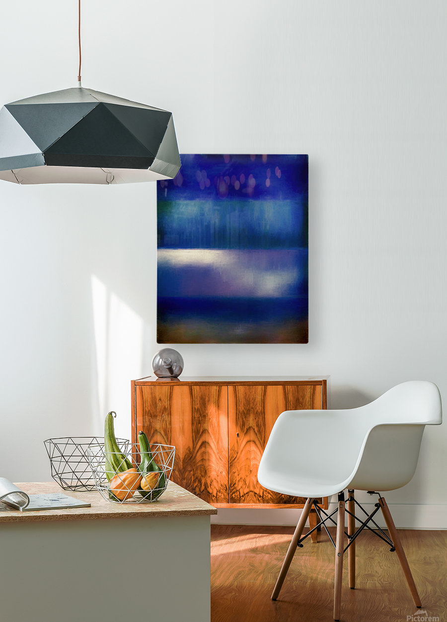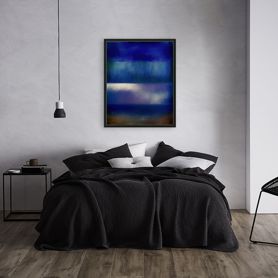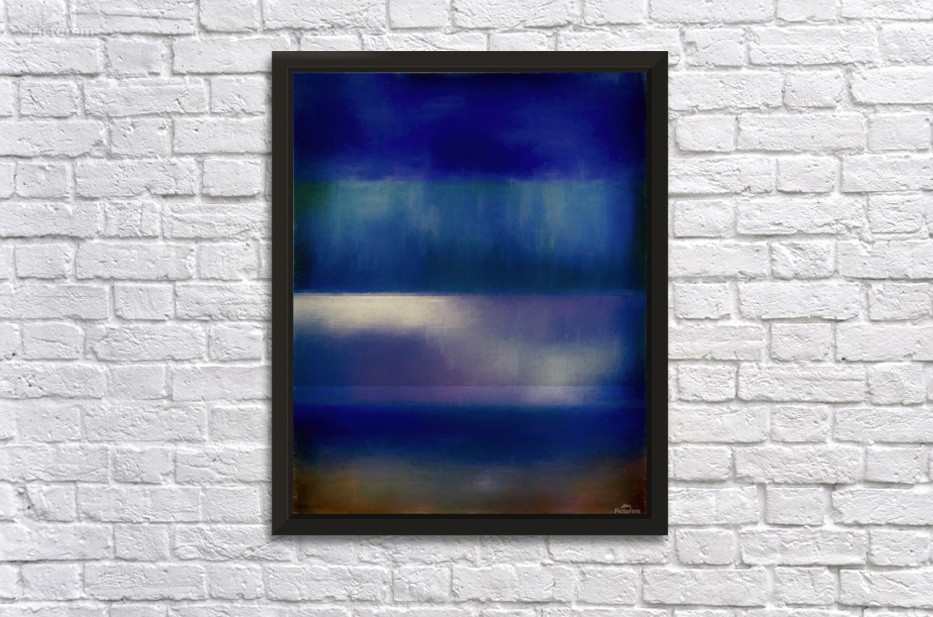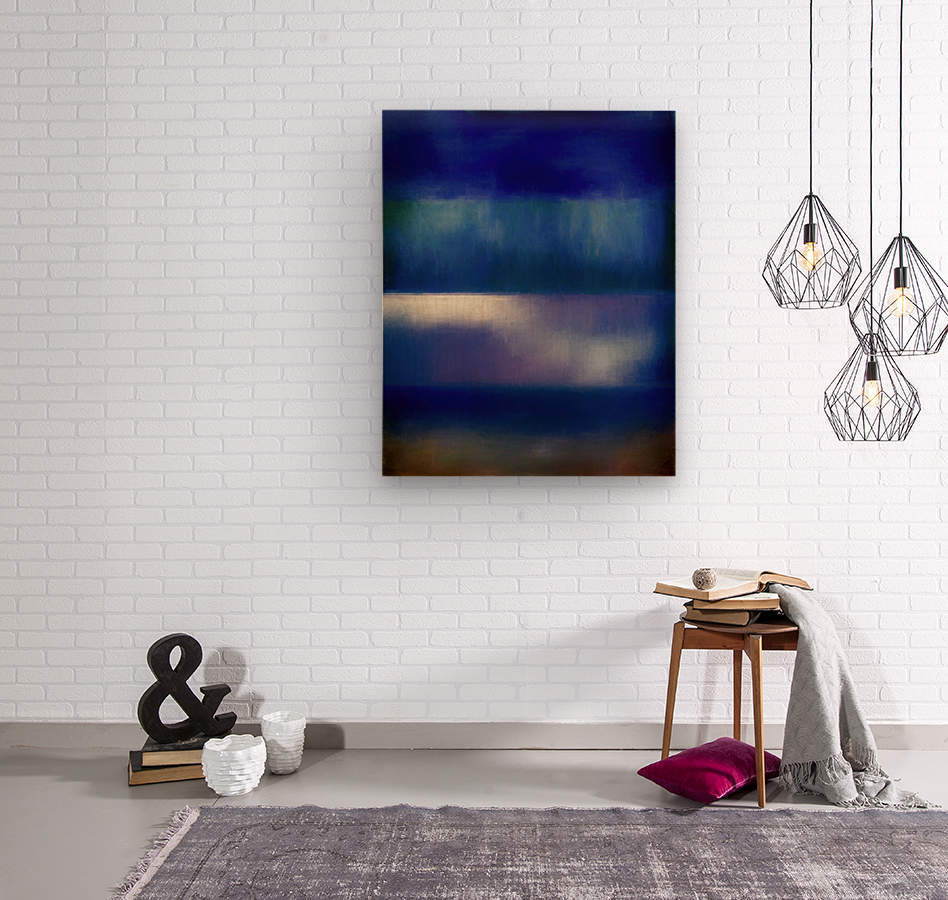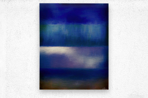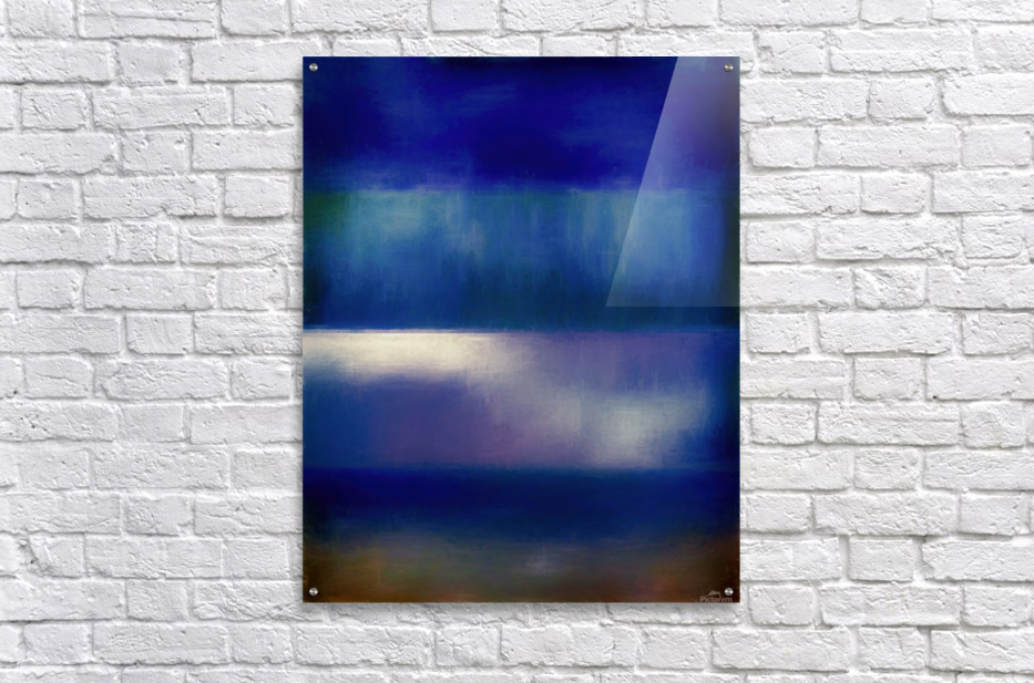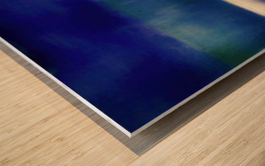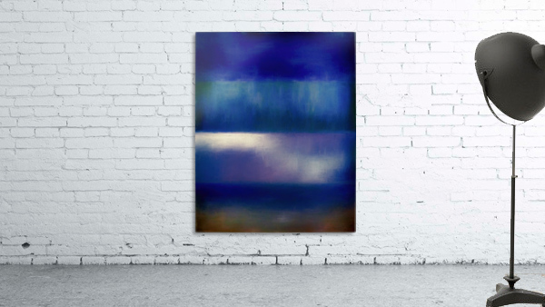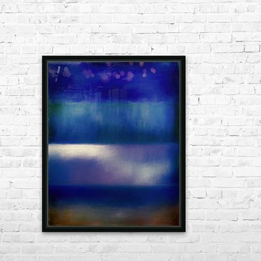 Stratified shades of cobalt, indigo, and other blues collide with bands of brown, green, white, and purple in this minimalist abstract art from Jon Wo...[+]