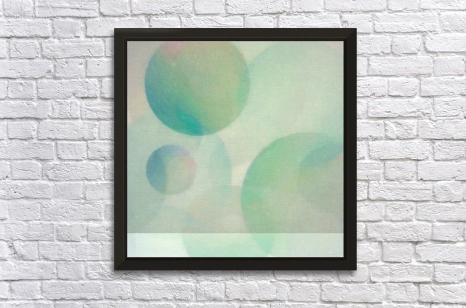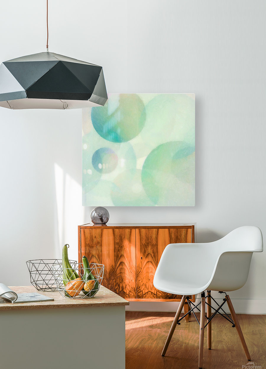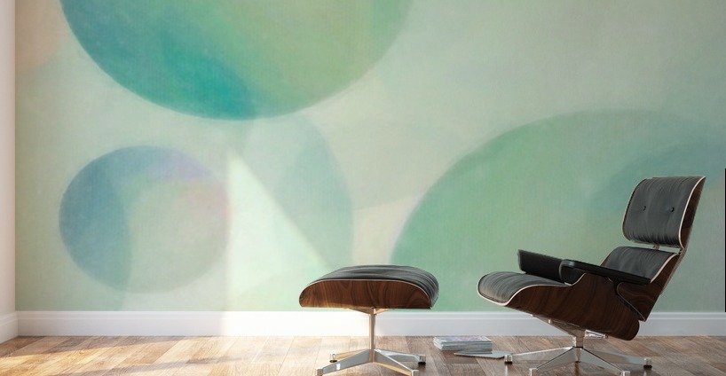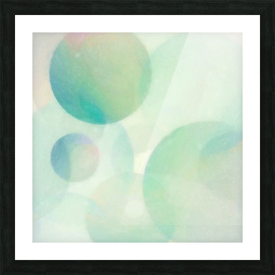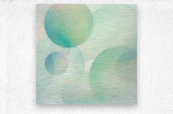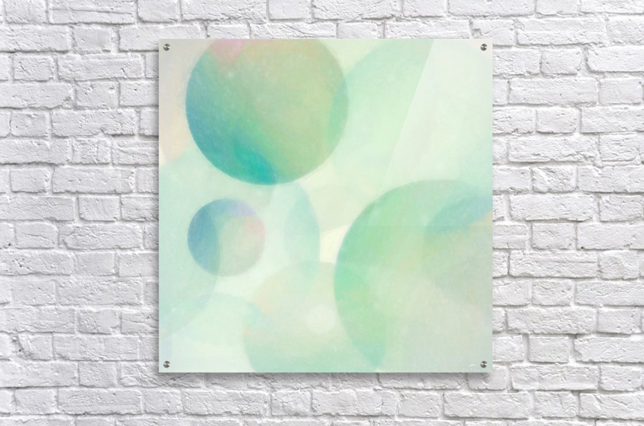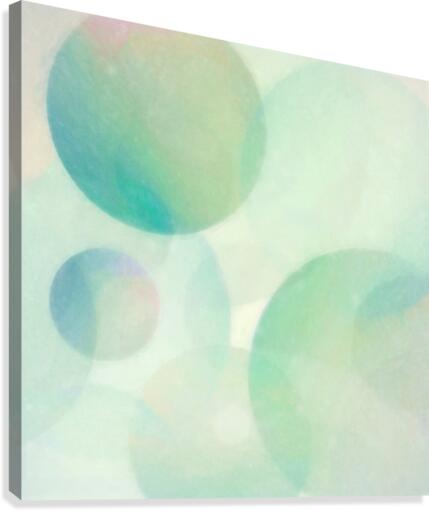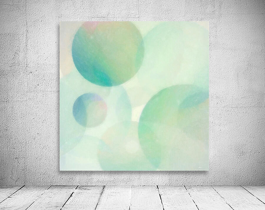 Soft pastel-colored multisized spheres in green, aqua, blue, pink, and purple converge in this abstract art by Jon Woodhams.