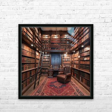 Traditional library, Floor-to-ceiling bookcases, Rolling ladder, Large wooden desk, Leather armchair, Antique rug, Warm lighting, High-resolution text...[+]