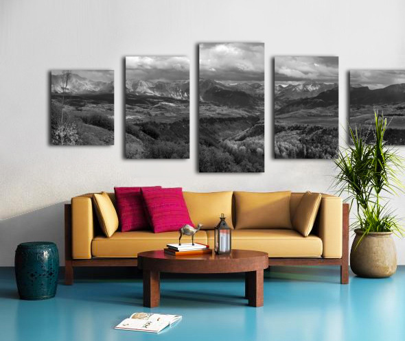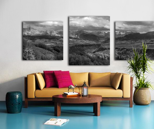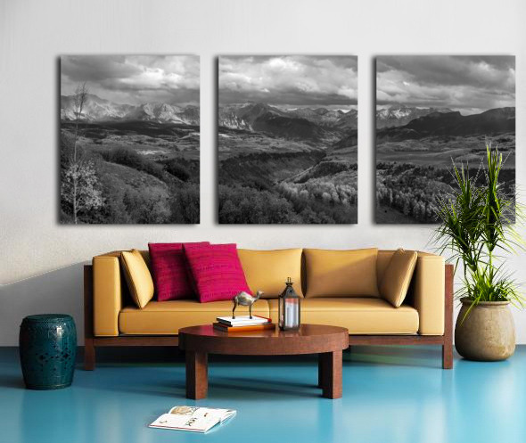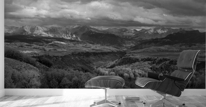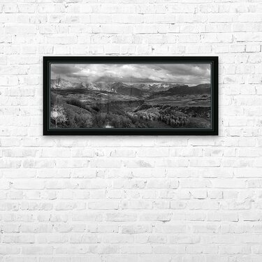 How can someone describe the wonder of the Uncompahgre National Forest in the San Juan Mountains, near Telluride, Ridgeway and Ouray, Colorado without something tangible to show? On this truly wondrous day the stars aligned for a stupendous Telluride Autumn and early winter snow capped San Juan Mountain pano photograph. Moments later the heavens opened up with torrential rain storm at sunset. The Autumn colors were at their peak. I couldn't have asked for a more stunning scene to capture. The photo is wonderful in acrylic and metal which enhances the beautiful and contrasting colors. Also available in color.