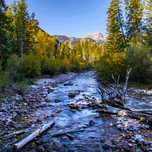 Along charming Snowmass Creek there are wonderful Autumn yellow Aspen views of Capital Peak Mountain, large fallen trees and multicolored rocks leadin...[+]
