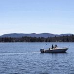 A motorboat with two people onboard is cruising on a calm Lake Winnipesaukee with a backdrop of the Ossipee Mountains. The sky is clear, and it's ...[+]