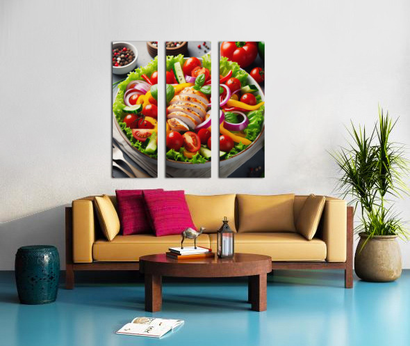 Chicken salad with tomato lettuce on wooden board 1715271954.6278 Canvas print