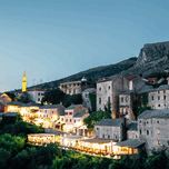 Night of Neretva riverside old town panorama view in Mostar Bosnia and Herzegovina