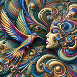 Vibrant colors and sweeping curves define a fantastical scene where a stylized woman's profile with elaborate hair intertwines with a vividly colored hummingbird in mid-flight. The intricate design suggests movement and harmony in nature, embodying a sense of dynamic beauty and energy.