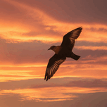 Un oiseau volant dans le ciel, ses ailes silhouettées contre le coucher de soleil.
