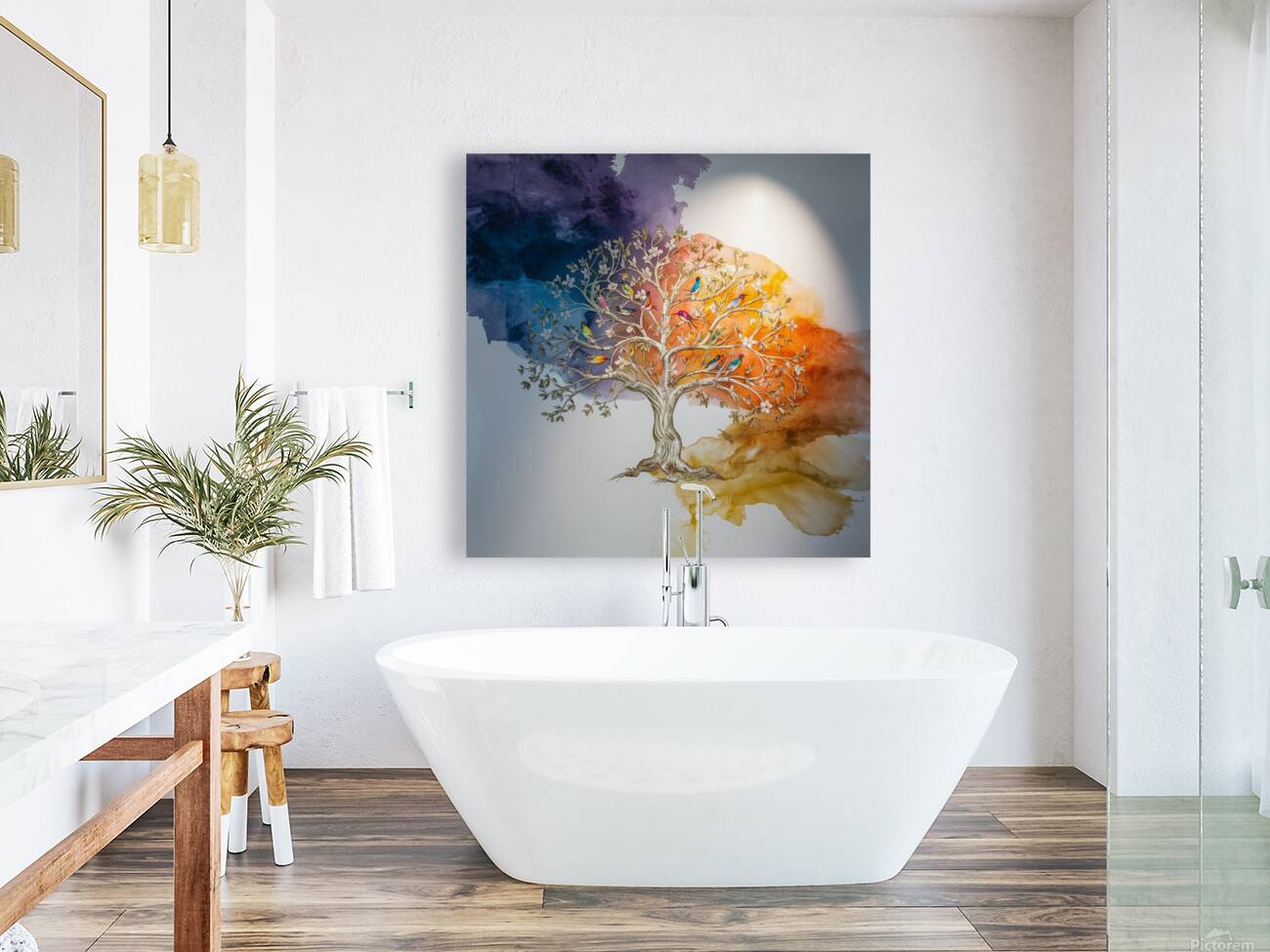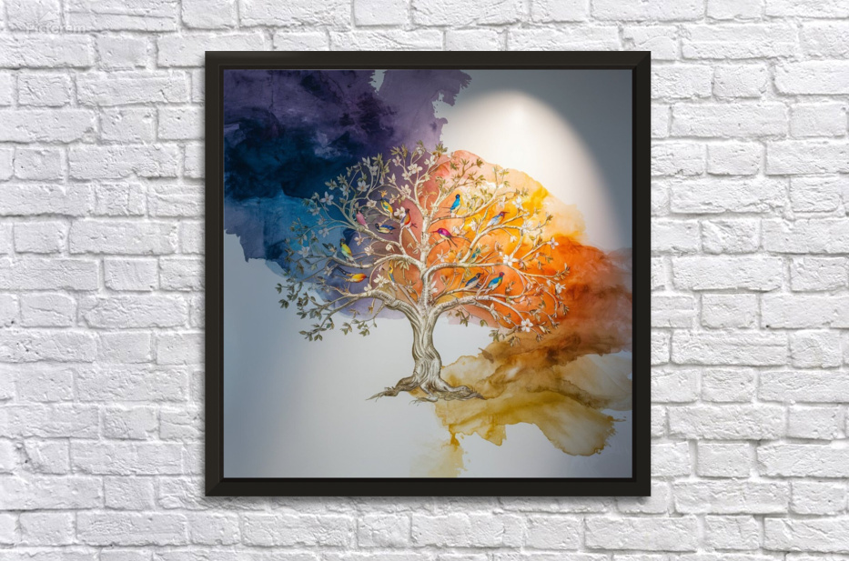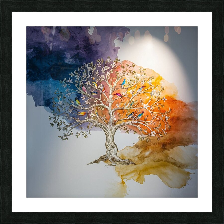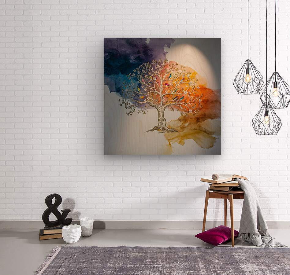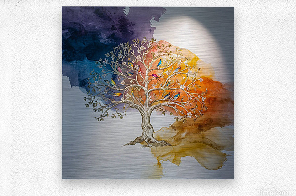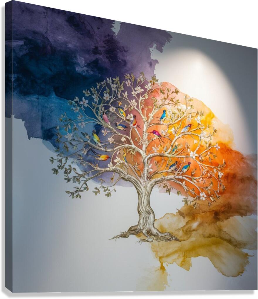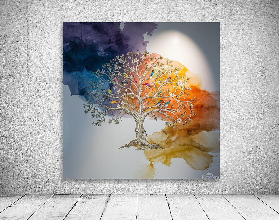 The wall panel features an intricate, nature-inspired design with a detailed tree in the center, its branches adorned with colorful birds and blossoms, set against a fluid, abstract watercolor background. The palette transitions from deep blues and purples at the top to warm oranges and yellows at the bottom, creating a serene yet vibrant focal point.