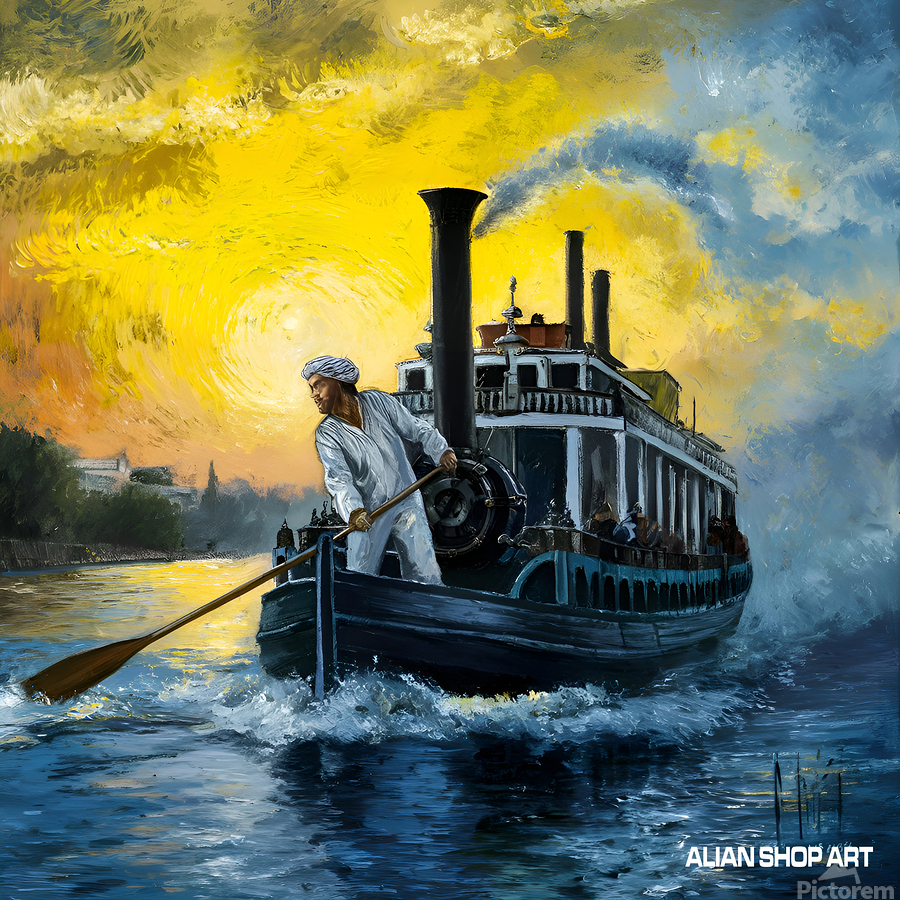 ABOUT THIS ARTWORK: A SAILOR RIDING A STEAMSHIP IN THE MIDDLE OF THE SEA SURROUNDED BY WAVES