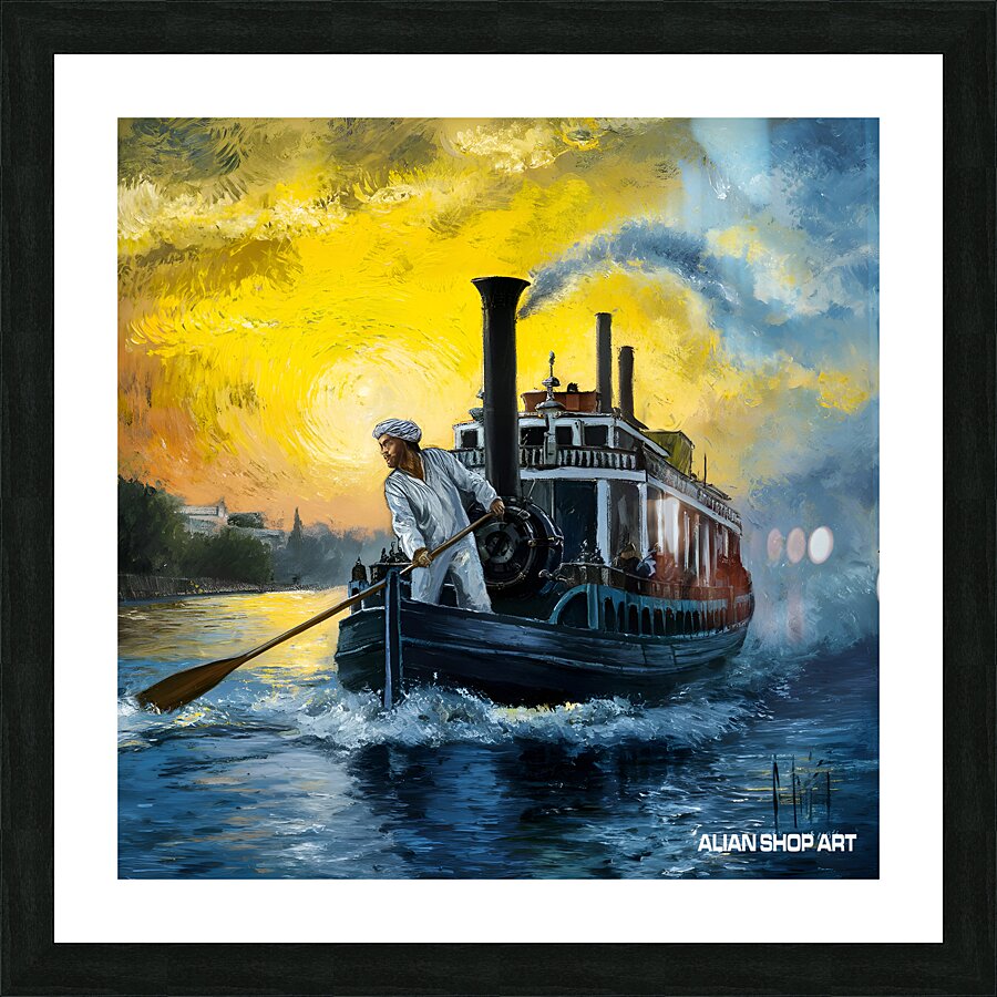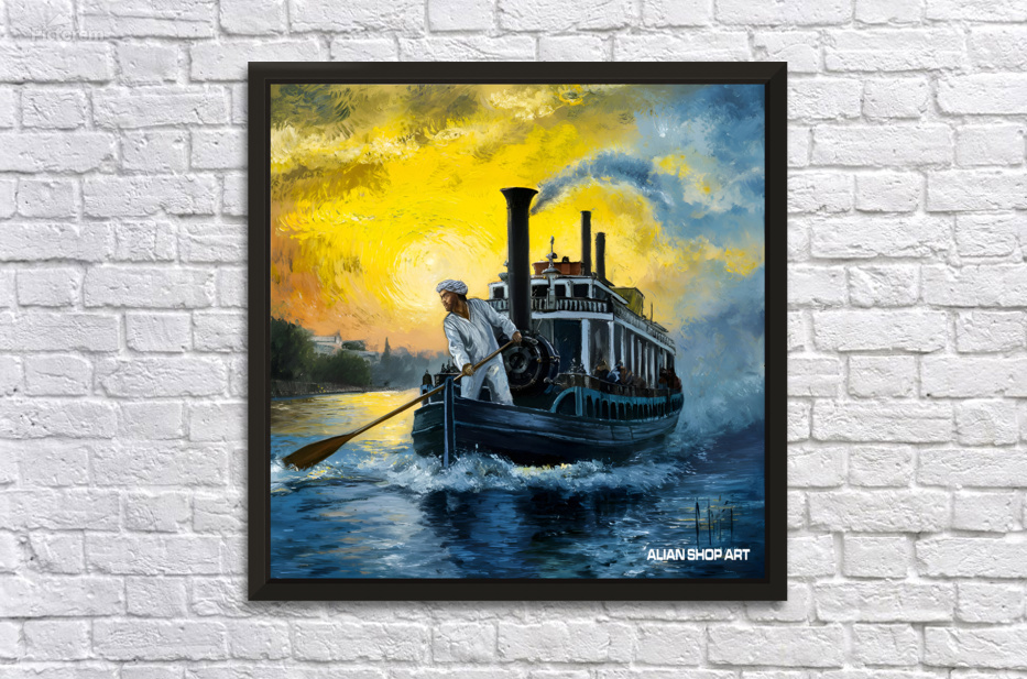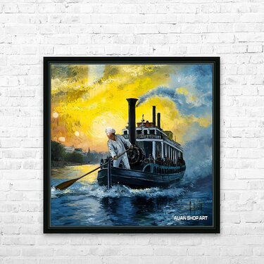 Get this artwork "A sailor riding a steamship in the middle of the sea surrounded by waves" in a framed print.