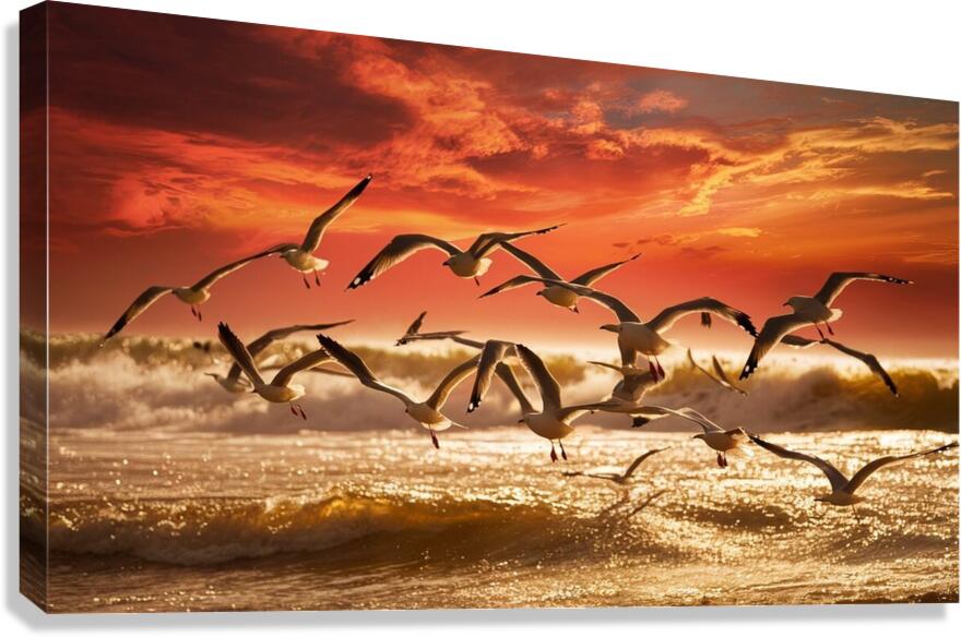 Seagulls Over Golden Waves: “A group of seagulls flying low over golden waves at sunset. The sky is filled with dramatic shades of orange and red, a...[+]