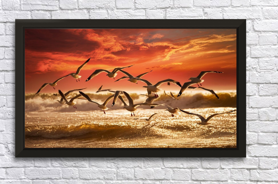 a stunning photograph of seagulls gracefully soar Picture Frame Printing