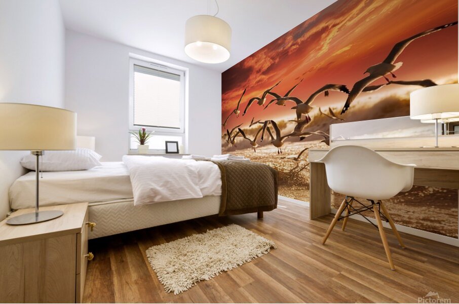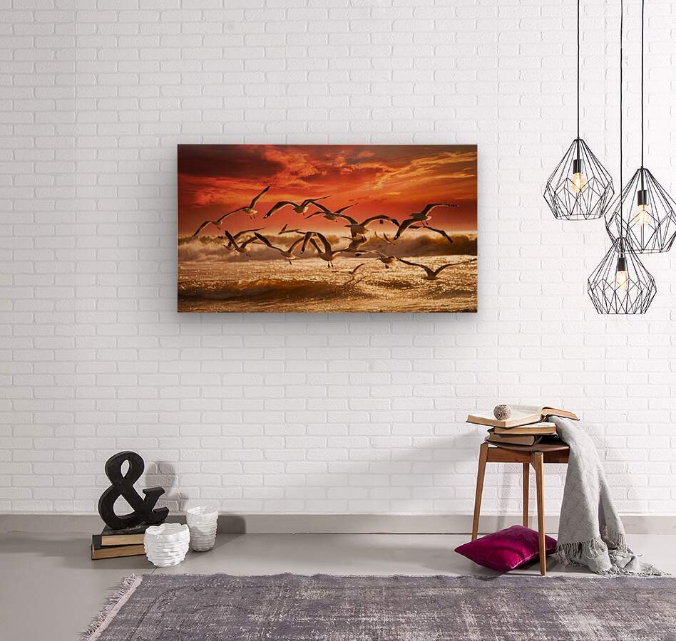 a stunning photograph of seagulls gracefully soar  Wood print