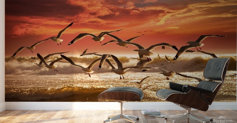 ABOUT THIS ARTWORK: A STUNNING PHOTOGRAPH OF SEAGULLS GRACEFULLY SOAR